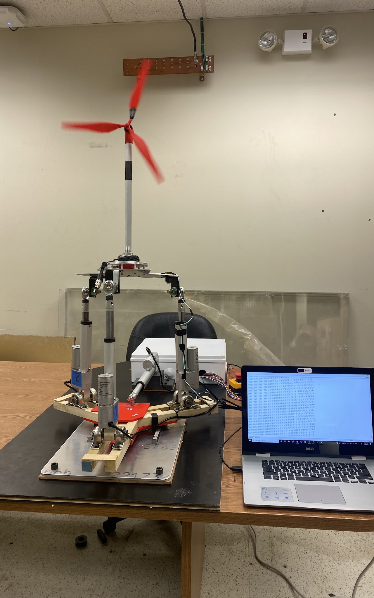 As part of our senior capstone project, my team built a prototype of a floating platform for emulating the motion of floating offshore wind turbines, that can be fully controlled for prescribed motion, and is being tested with a model turbine at the UTD wind tunnel. To emulate the motion profile and force envelope of a FOWT, we use a scaled-down version of a wind turbine and place it on a platform, capable of motion 3 degrees of freedom. Aeroelastic scaling documents and OpenFast (whole turbine simulation tool) were used to define motion constraints in roll, pitch, yaw, and surge, sway and heave direction to optimize our robotic emulator for the given task. As part of our preliminary design analysis, we considered a 6DOF Stewart platform that uses 6 linear actuators to perform the required motion. A Simulink model was set up for performing basic controls analysis and we plan on using the inbuilt Simulink optimization tool. Upon further analysis, it was determined that primarily independently controlling 3DOF (Heve, Roll, and Pitch) is our focus, and thus necessary modifications were made. Our project sponsor is Dr Valerio Iungo, a professor at UT Dallas and principal researcher at the Windflux lab.